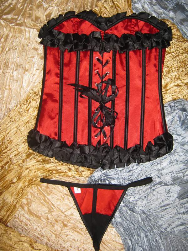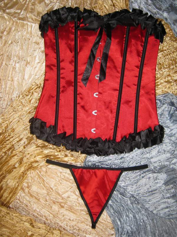 Классическая шнуровка сзади, прочная стальная застежка-бюск спереди. Трусики-стринги в комплекте