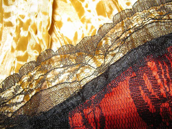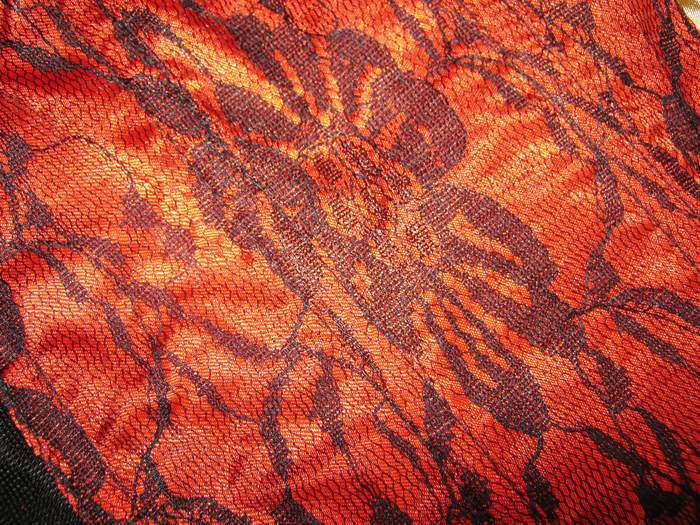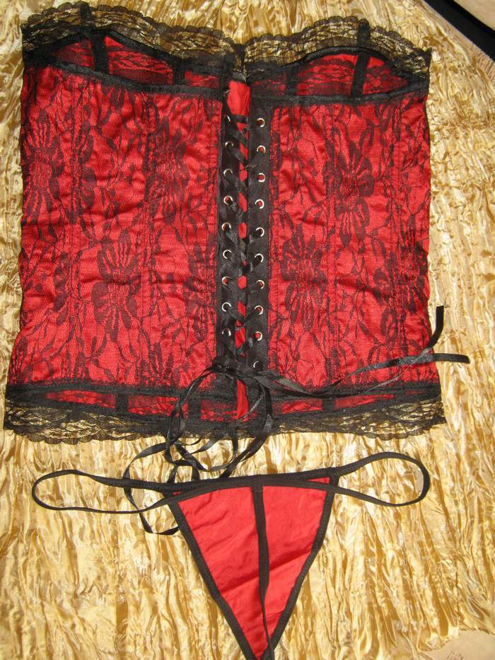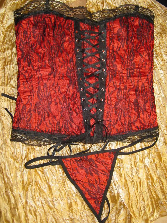 Эффектный красный корсет, отделанный черным кружевом. Две шнуровки - декоративная впереди и утягивающая сзади. Молния слева. Трусики-стринги в комплекте