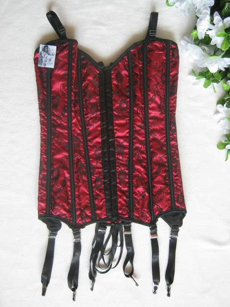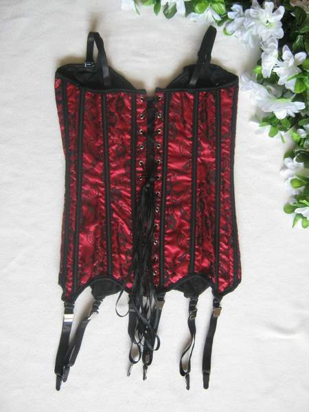 Классический корсет выполнен из двух видов ткани - красной основы и черного кружева. Шнуровка сзади, спереди застежка - крючочки. В комлекте съемные подвязки для чулок