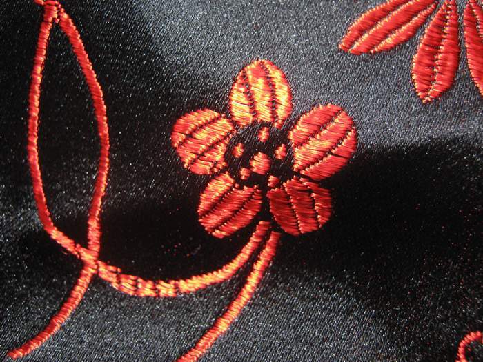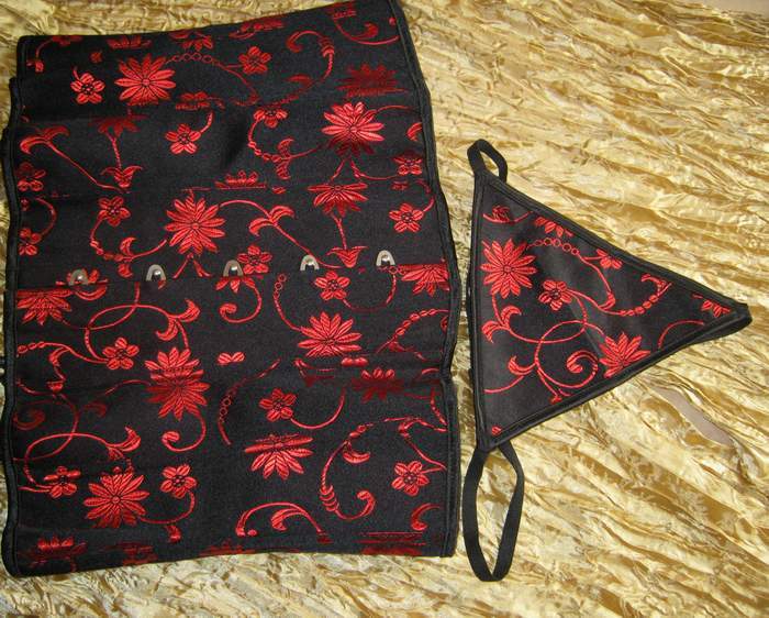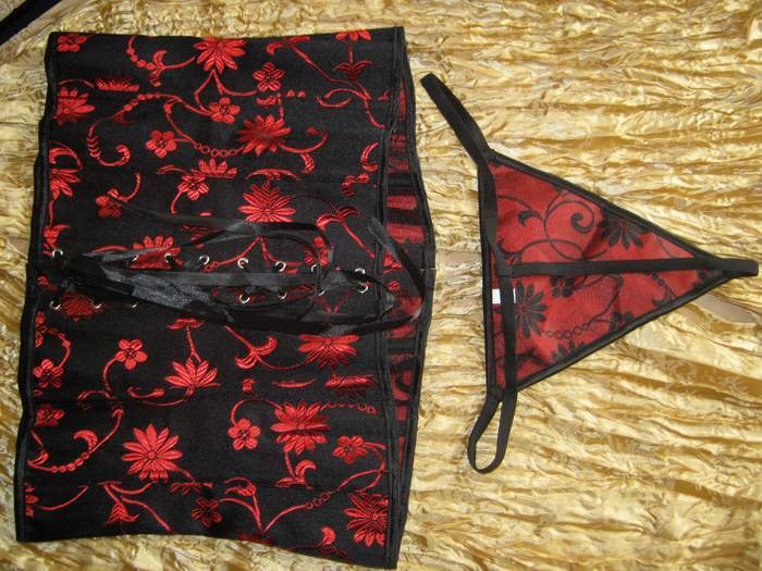 Подгрудный черный корсет с шикарной красной вышивкой. Спереди застежка бюск, сзади шнуровка. В комплекте трусики-стринги