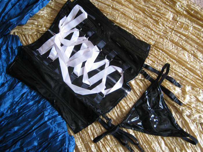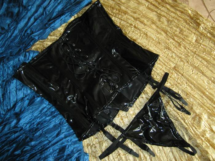 Черный лаковый корсет из материала, имитируещего латекс (тканевая основа с лаковым напылением). Корсет спереди на молнии, сзади на шнуровке. Декорирован широкой розовой лентой. Трусики-стринги и отстегивающиеся подвязки для чулок в комплекте.