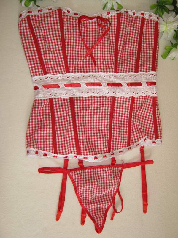 Яркий женственный корсет в мелкую клетку украшен красными вертикальными полосками и атласными лентами. Сзади застежка - крючочки.