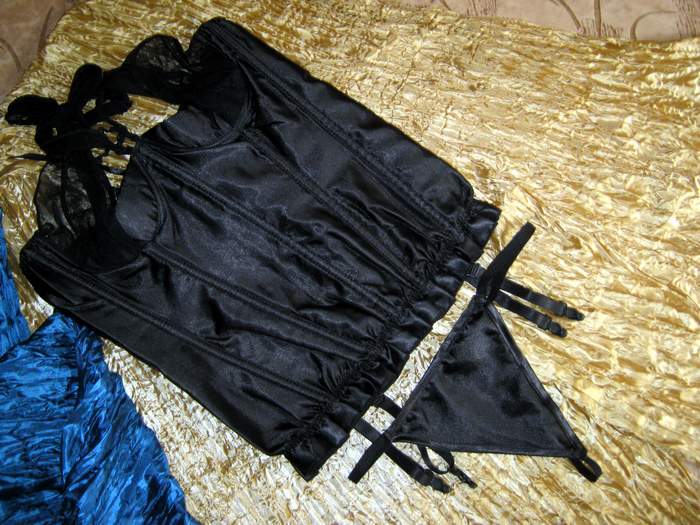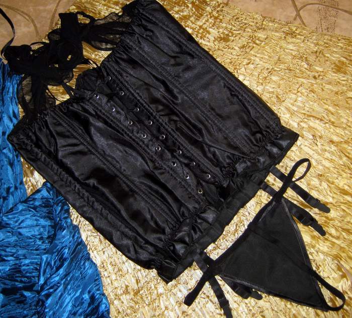 Черный атласный корсет с частично открытой грудью. Украшен двумя шифоновыми широкими лентами, которые могут быть завязаны на шее, превращая этот наряд из эротическогово вполне целомудренный. Корсет застегивается сбоку на крючечки, сзади шнуровка. Трусики-стринги и съемные подвязки для чулок в комплекте.