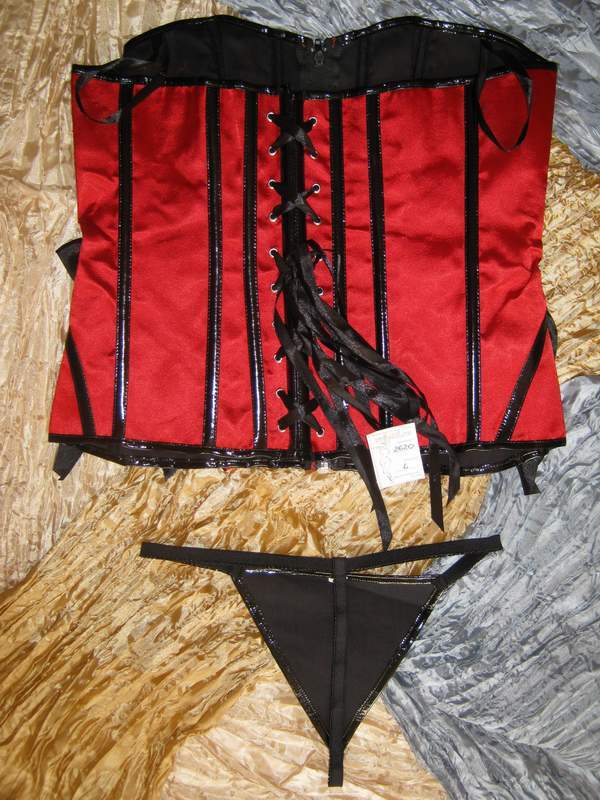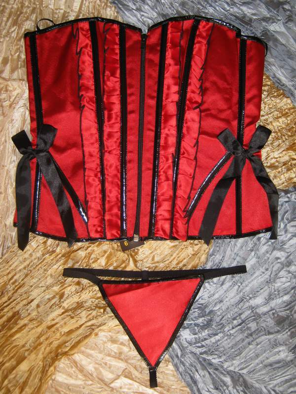 Атласный корсет, декорированный вертикальными рюшами и контрастными черными вставками из материала, имитирующего латекс. Корсет спереди на молнии, сзади - классическая шнуровка.