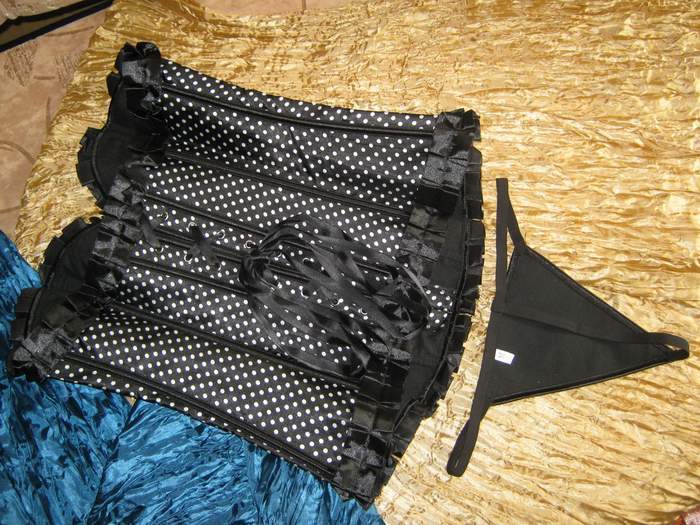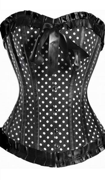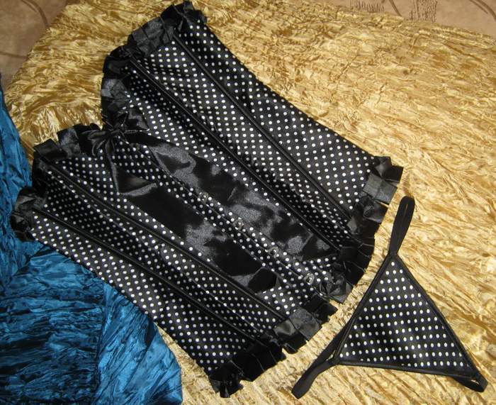 Элегантный черный корсет в мелкий белый горошек. Украшен широкой атласной лентой. Спереди застежка бюск, сзади шнуровка. Трусики-стринги в комплекте