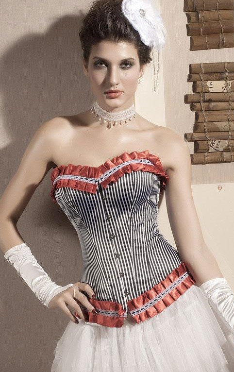 Корсет в вертикальную полоску вытянет силуэт вверх и подчеркнет талию. Сзади на корсете классическая шнуровка.