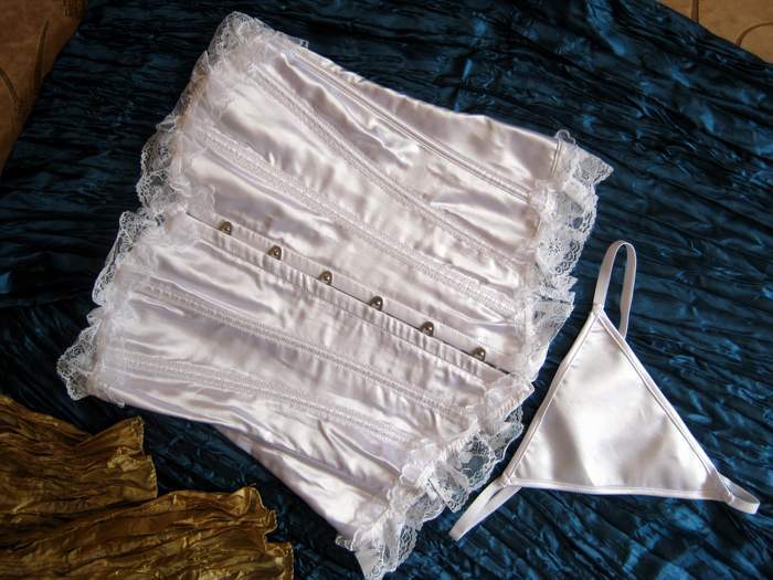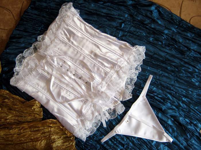 Белый атласный корсет, украшенный сверху и снизу мягким кружевом. Впереди застежка бюск, сзади шнуровка. Трусики-стринги в комплекте
