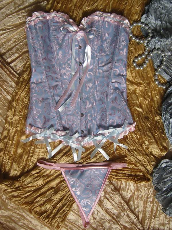 Классический жаккардовый корсет с пластиковыми ребрами жесткости. Спереди стальная застежка бюск, сзади шнуровка. Трусики-стринги в комплекте