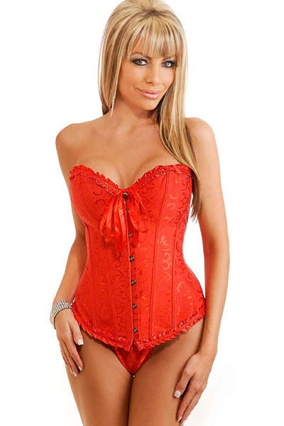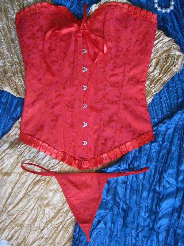 Классический жаккардовый корсет с пластиковыми ребрами жесткости. Спереди стальная застежка бюск, сзади шнуровка. Трусики-стринги в комплекте