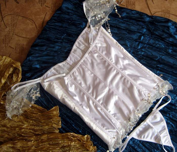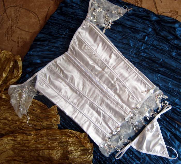 Белый атласный корсет без задней шнуровки. Застегивается на крючечки спереди. Украшен кружевными рукавами-крылышками с пайетками. Такое же кружево пущено по нижнему краю корсета. Трусики-стринги в комплекте.
