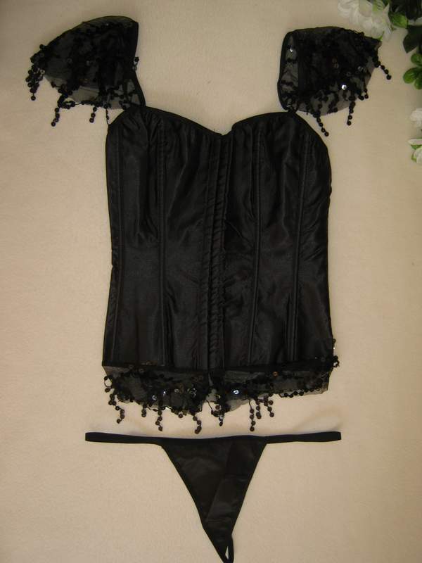 Черный атласный корсет без задней шнуровки. Застегивается на крючочки спереди. Украшен кружевными рукавами-крылышками с пайетками. Такое же кружево пущено по нижнему краю корсета. Трусики-стринги в комплекте.