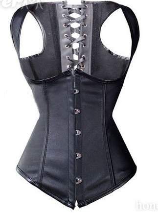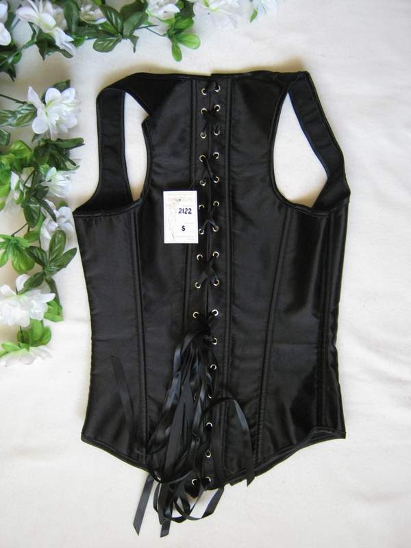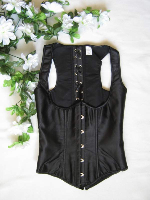 Подгрудный атласный корсет с закрытой спинкой классического черного цвета. В конструкции используется застёжка - стальной бюск. Вдоль спинки идет шнуровка.