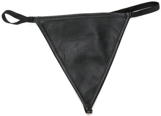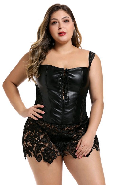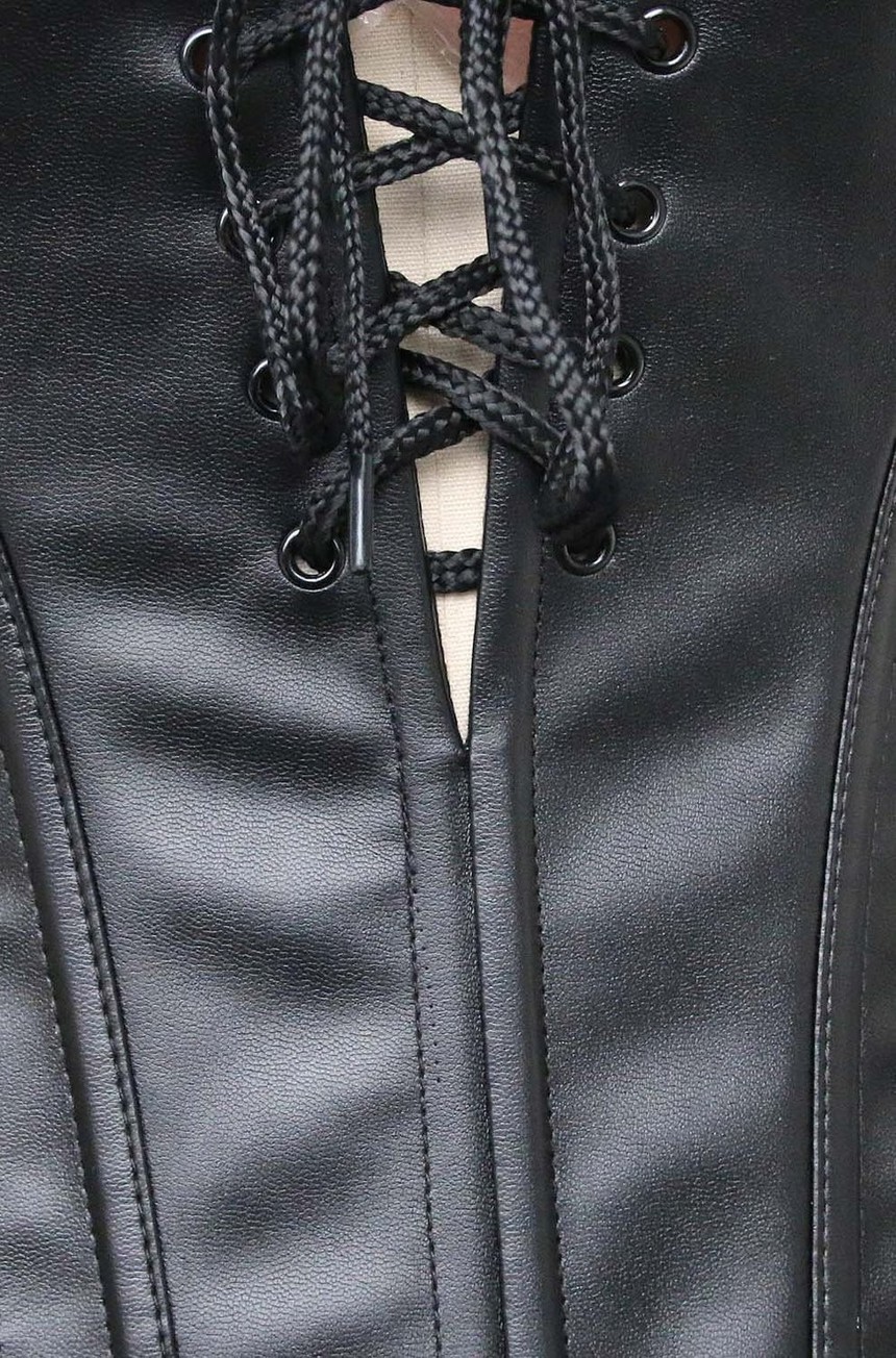 Корсет из искусственной кожи на бретельках. Спереди корсета на груди находится шнуровка, а сзади по всей длине молния. Трусики-стринги в комплекте.