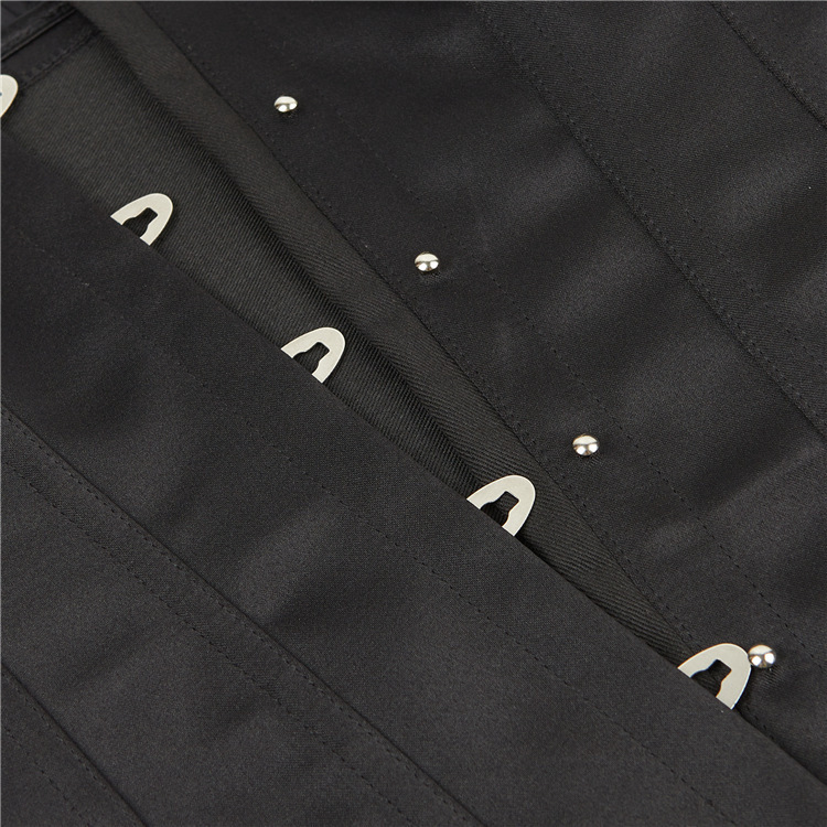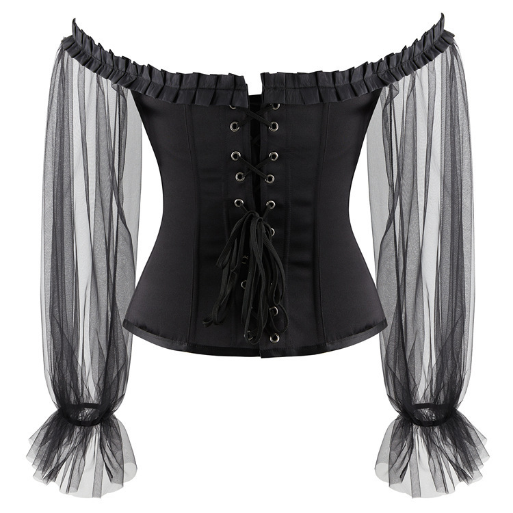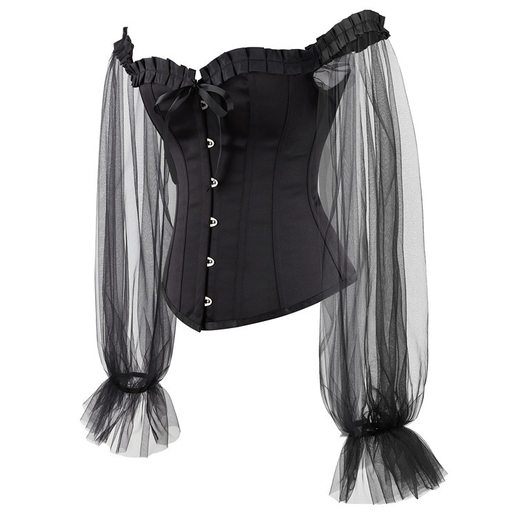 Корсет выполнен из ткани, которая практически не растягивается. Рукова выполнены из полупрозрачной мокросетки. Спереди застежка бюск, сзади шнуровка.