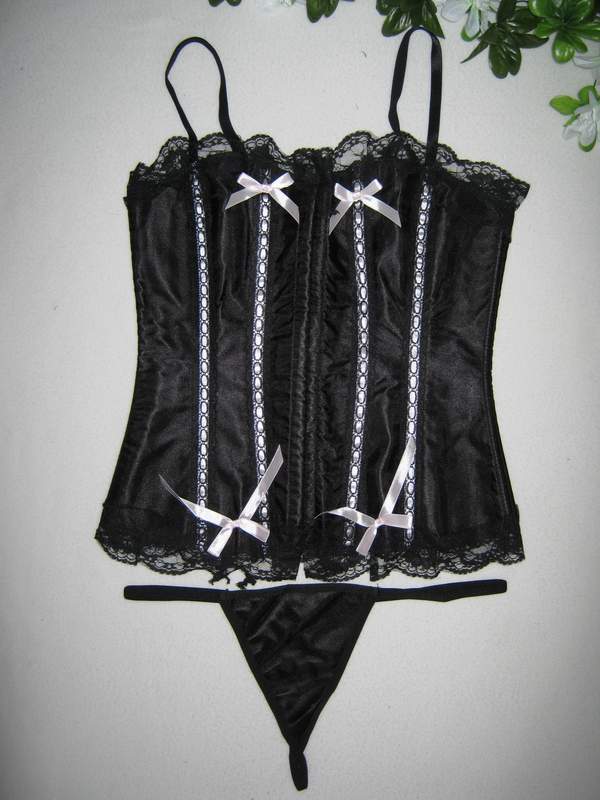 Классический корсет черного цвета. Декорирован атласными лентами и бантиками. Спереди застежка-крючочки, сзади классическая шнуровка.