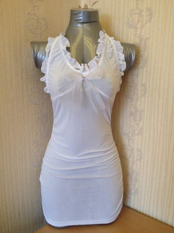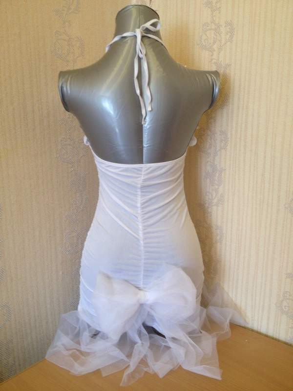 Обтягивающая сорочка с больши бантом сзади в комплекте с фатой и трусиками хорошо подойдет для первой брачной ночи!