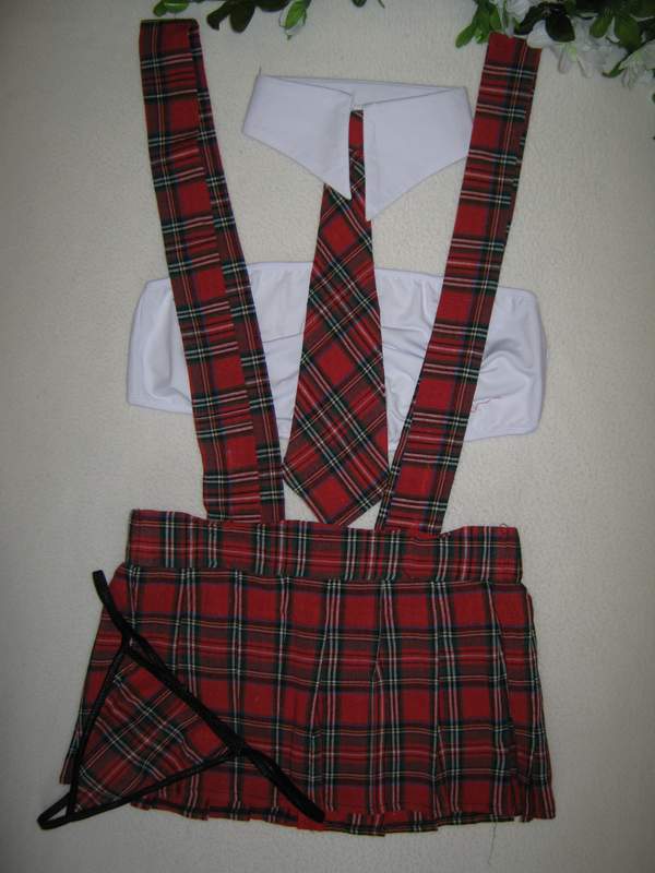 Клетчатый комплект включает юбочку на лямках, галстук, трусики, белый воротничок и топ.