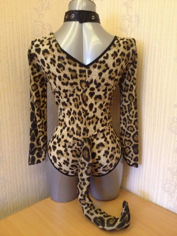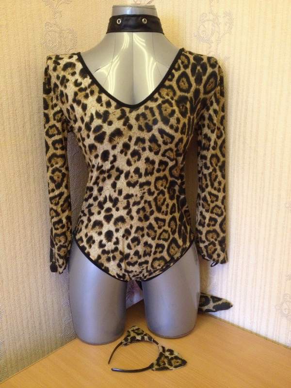 Костюм игривой кошечки включает боди с хвостом, ошейник и уши. Костюм выполнен из эластичного мягкого материала с леопардовой расцветкой.