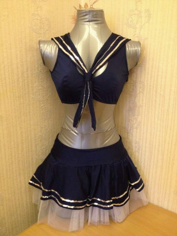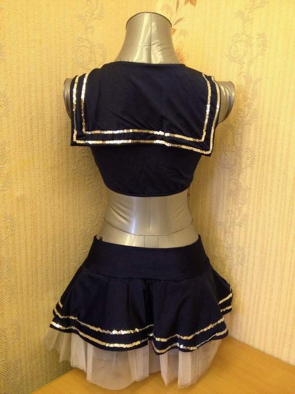 Костюм морячки состоит из юбки с пышным подъюбником, мини шапочки, топа со стразами и трусиков.
