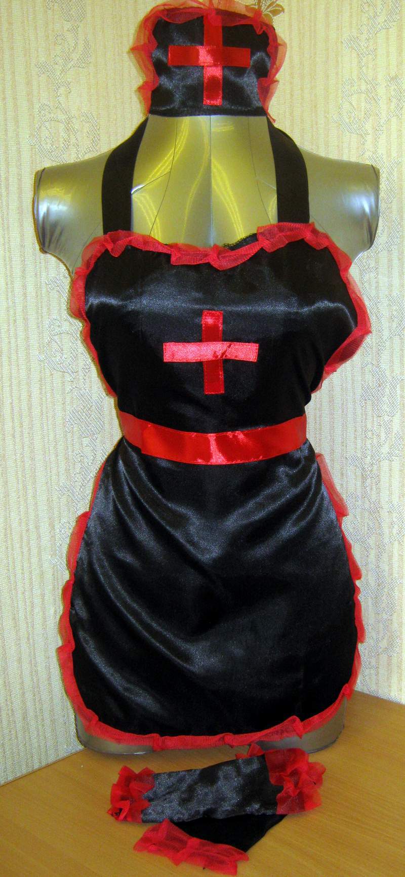 Замечательный эротический костюм игривой медсестры, выполненный из черного материала с окантовкой красного цвета. Яркое сочетание черного и красного придадут вашему образу особый стиль и колорит.