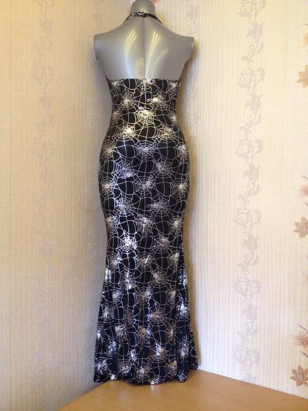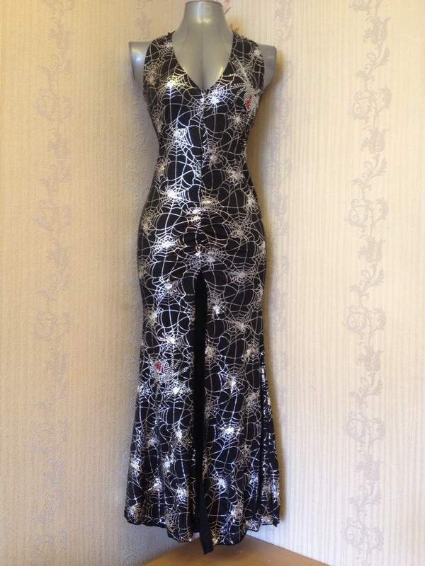 Чарующий костюм ведьмы состоит из длинного черного платья в пол и остроконечной шляпы. Платье с пикантным высоким разрезом и глубоким декольте украшено серебряным рисунком в виде паутины.