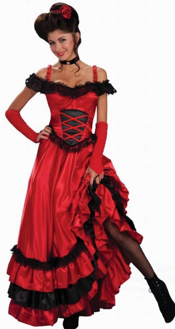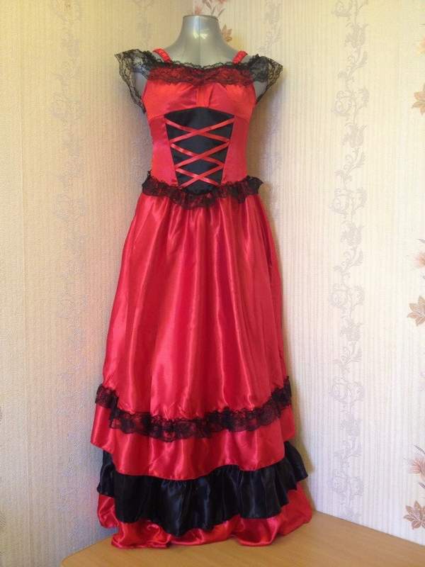 Ярко-красное платье в стиле кабаре создаст дерзкий и соблазнительный образ. Юбка платья многослойная. Декором служит черное кружево.