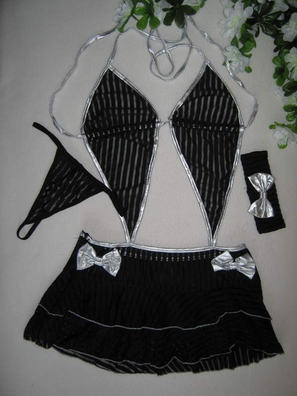 Полосатый копмлект обрамлен серебряной окантовкой. Юбочка на молнии.