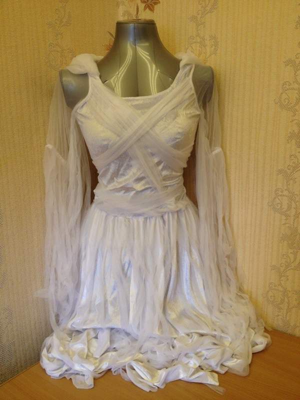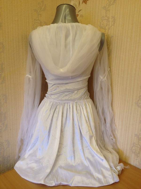 Потрясающий карнавальный костюм невесты хорошо подойдет для празднования Хэллоуина. Платье с капюшоном выполнено из мягкого бархатного материала и марли.