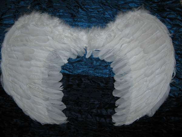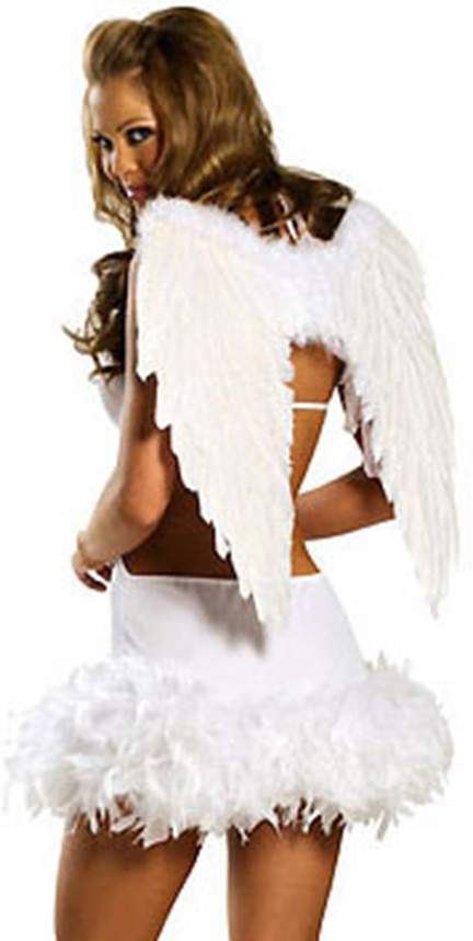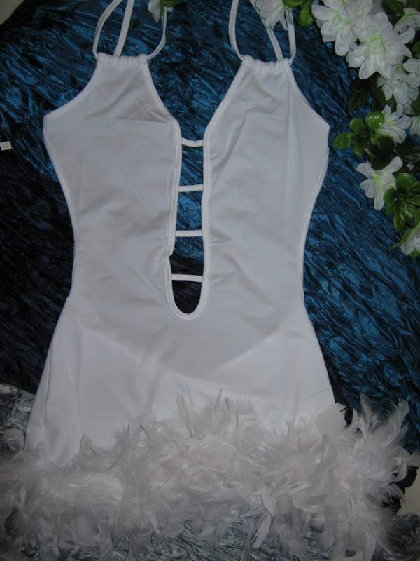 Белое платье с открытой спинкой и юбочкой, украшенной перьями. Крылья на резинке в комплекте.
