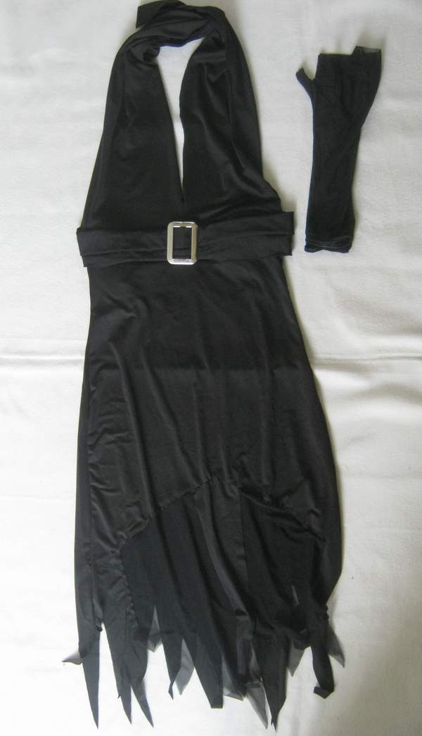 Костюм включает черное платье ведьмы с ассиметричным подолом и остроконечную шляпу. Костюм удачно подойдёт для вечеринки в честь праздника "Хэллоуин".