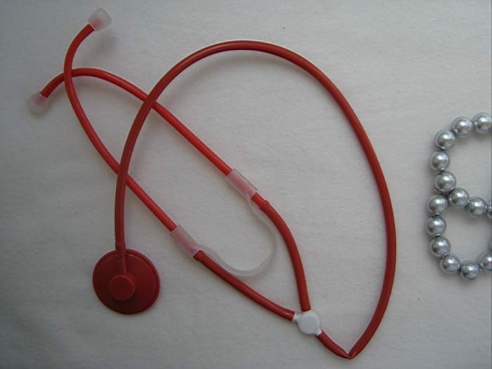 Красный пластиковый стетоскоп отлично подходит к игровому костюму "медсестра".