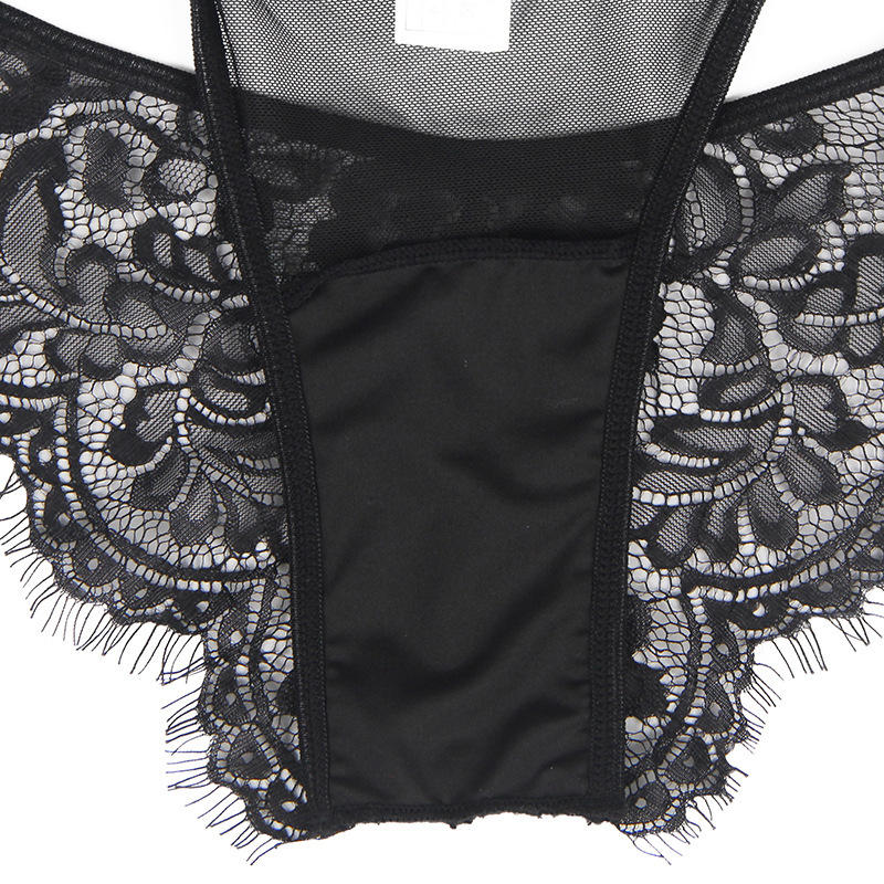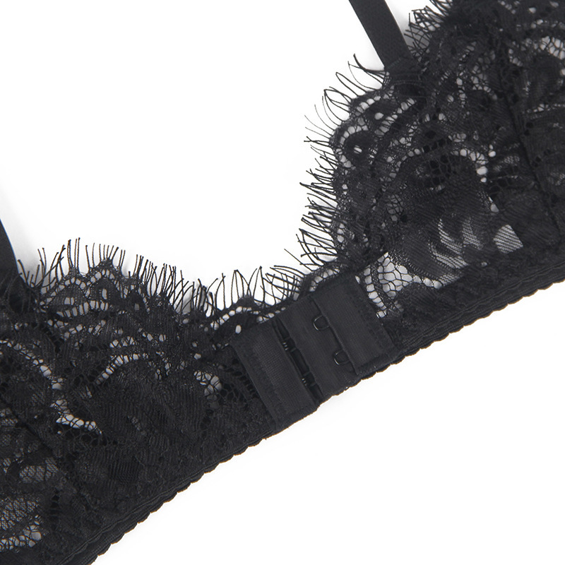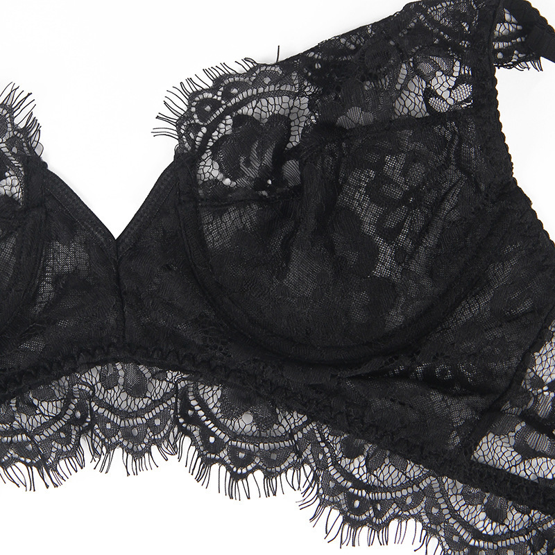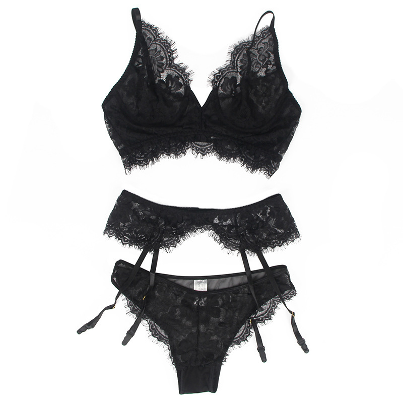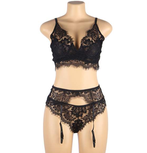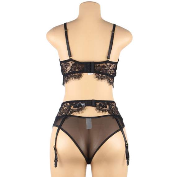 Очень женский, милый ажурный комплект нижнего белья из бюстгальтера, пояса для чулок и трусиков для истинных романтиков. Ажурный комплект выполнен из полу-прозрачной кружевной ткани черного цвета с цветочным орнаментом.