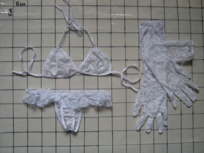 Кружевной комплект из трусиков, бюстгальтера и перчаток.