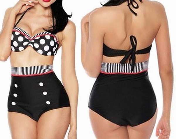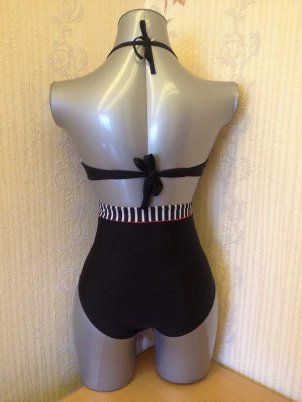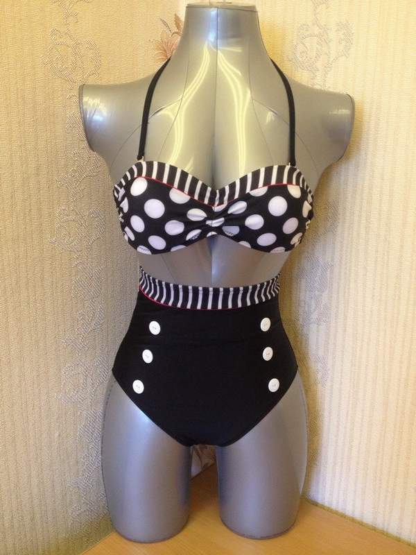 Очень интересная модель купальника в стиле Pin Up 50-х годов. Раздельный купальник включает топ в горошек и трусики с завышенной талией.