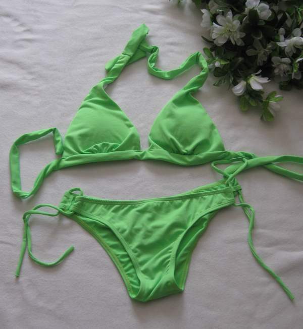 Раздельный купальник ярко-летнего салатового цвета придаст задора и игривости любой девушке. Лиф имеет поролоновые вставки, завязывается на шее и спине. Трусики-слипы завязываются имеют боковые завязки.