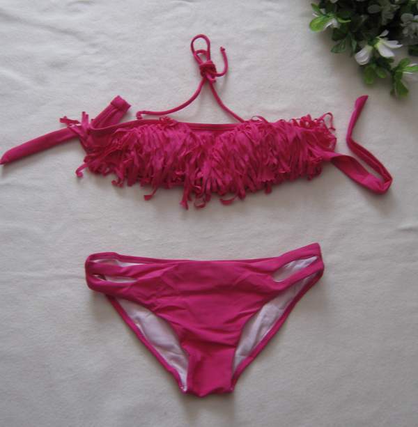 Раздельный купальник розового цвета. Топ декорирован бахромой из ткани, а плавки - вырезами по бокам. Топ с поролоновыми вставками, завязывается на спине. В комплект входит съемная поддерживающая бретель через шею.