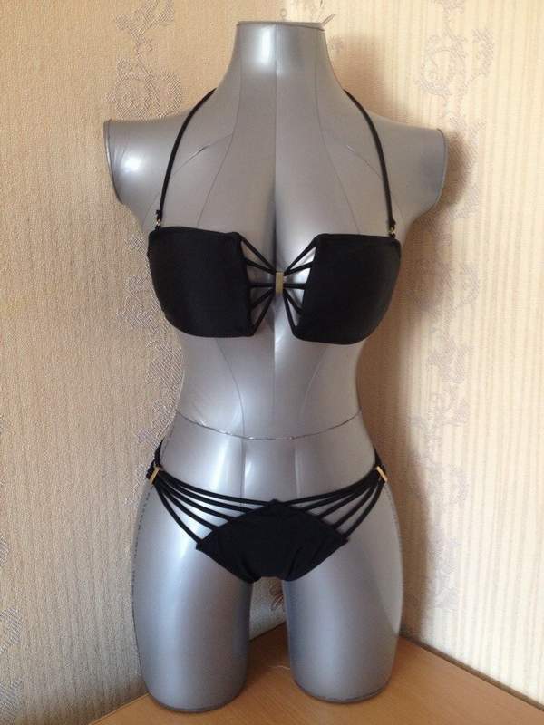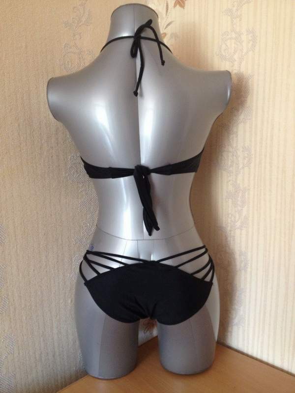 Раздельный купальник черного цвета. Лиф выполнен в виде бандо, завязывающегося на спине и украшенного декоративными веревочками спереди. Имеется съемная бретель через шею. Трусики также украшены декоративными веревочками по бокам.