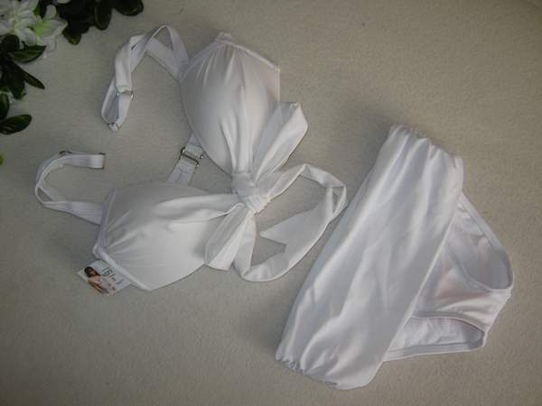 Однотонный раздельный купальник белого цвета. Интересный дизайн купальника привлекает взгляд.