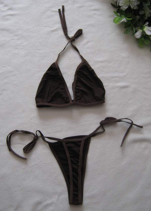 Открытое бикини насыщенного кофейного цвета выделит Вас на пляже, выгодно подчеркивая бронзовый загар. Вкомплекте лиф и трусики-стринги.