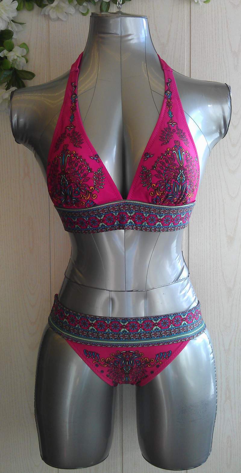 Яркий раздельный купальник завязывается через шею.