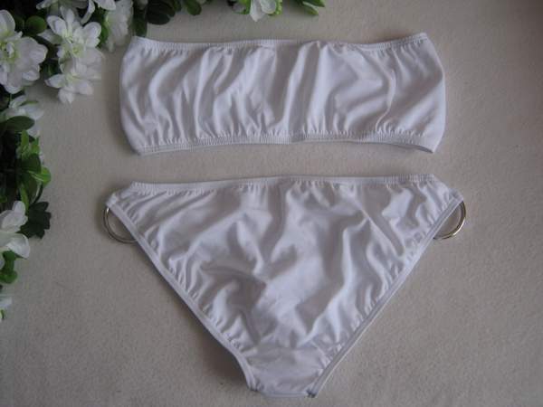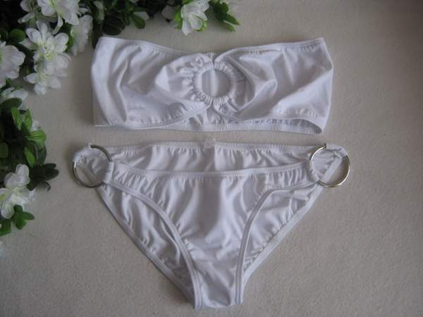Раздельный однотонный купальник, украшенный металлическими кольцами. Топ без завязок