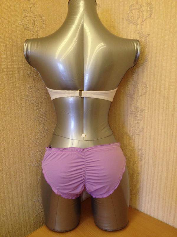 Бело-фиолетовый раздельным купальник. Плавки декорированы рюшами по краю и вертикальной сборкой сзади. Топ белого цвета украшен брошью. Топ с поролоновыми чашечками, сзади на застежке, дополнен съемной бретелью через шею.