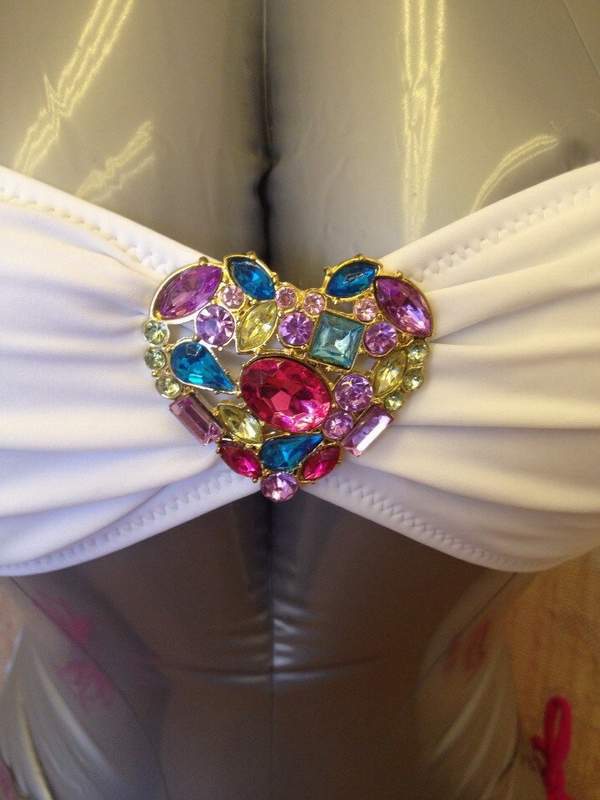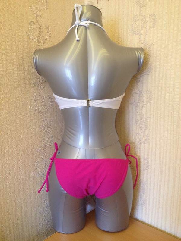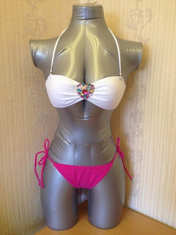 Раздельный купальник включает белый топ с брошью в виде сердечка и розовые трусики, которые регулируются завязками по размеру. Чашечки топа с поролоновыми вкладышами. В комплекте съемная бретель.