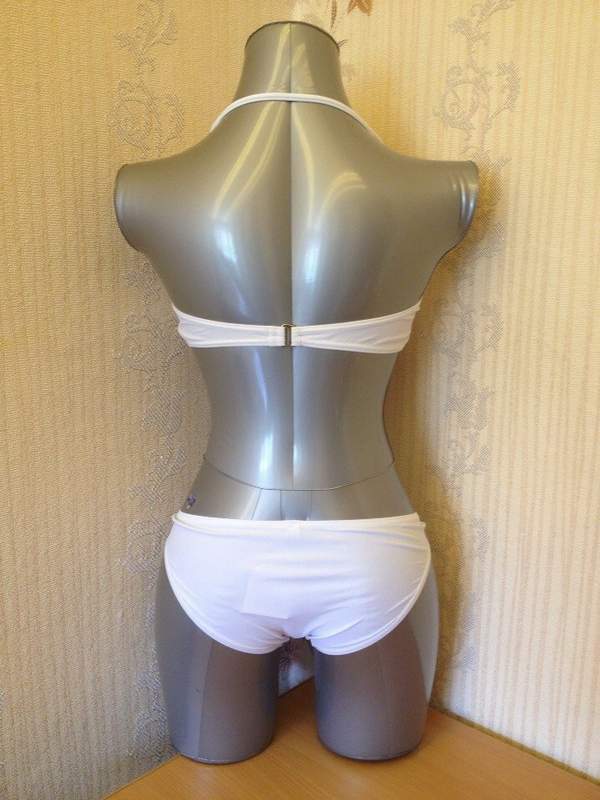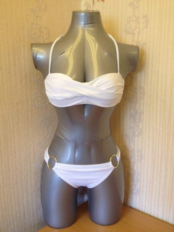 Раздельный купальник белого цвета. Лиф с поролоновыми вставками, сзади на застежке. Трусики декорированы металлическими кольцами. Лиф комплектуется съемной поддерживающей бретелью через шею