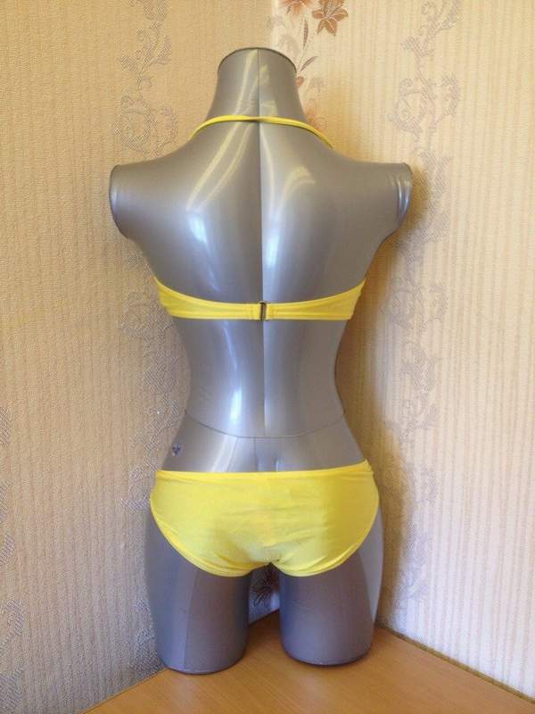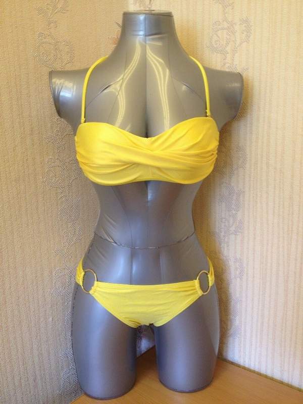 Раздельный купальник желтогоцвета. Лиф с поролоновыми вставками, сзади на застежке. Трусики декорированы металлическими кольцами. Лиф комплектуется съемной поддерживающей бретелью через шею