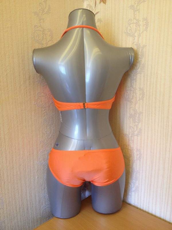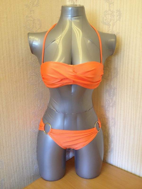 Раздельный купальник ярко-оранжевого цвета. Лиф с поролоновыми вставками, сзади на застежке. Трусики декорированы металлическими кольцами. Лиф комплектуется съемной поддерживающей бретелью через шею