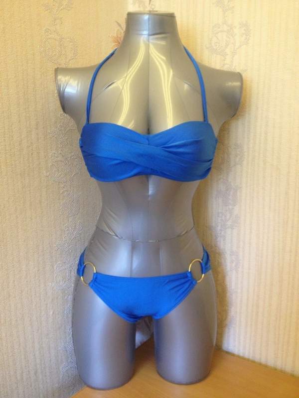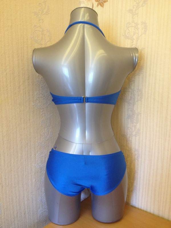 Раздельный купальник насыщенного голубого цвета. Лиф с поролоновыми вставками, сзади на застежке. Трусики декорированы металлическими кольцами. Лиф комплектуется съемной поддерживающей бретелью через шею