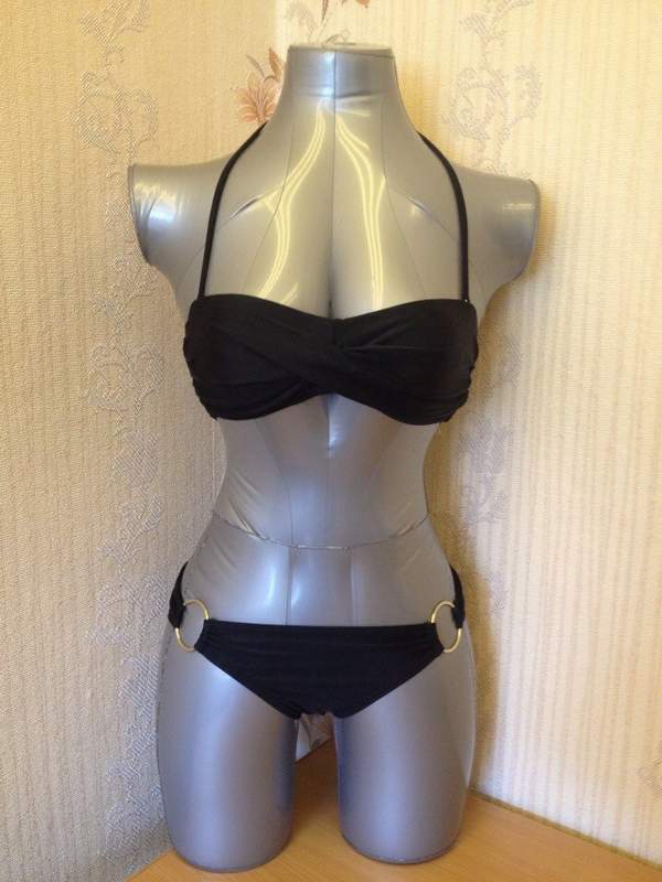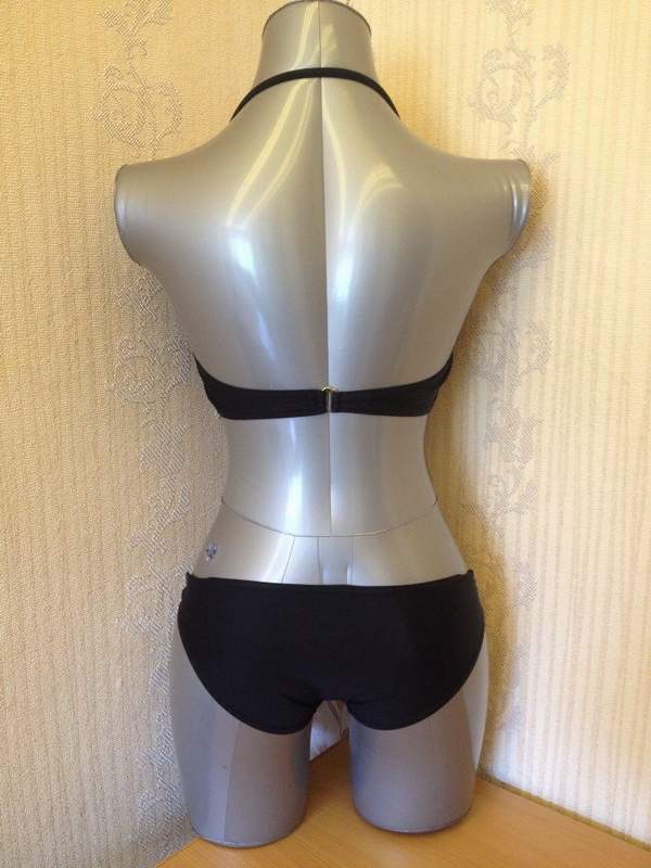 Раздельный купальник черного цвета. Лиф с поролоновыми вставками, сзади на застежке. Трусики декорированы металлическими кольцами. Лиф комплектуется съемной поддерживающей бретелью через шею