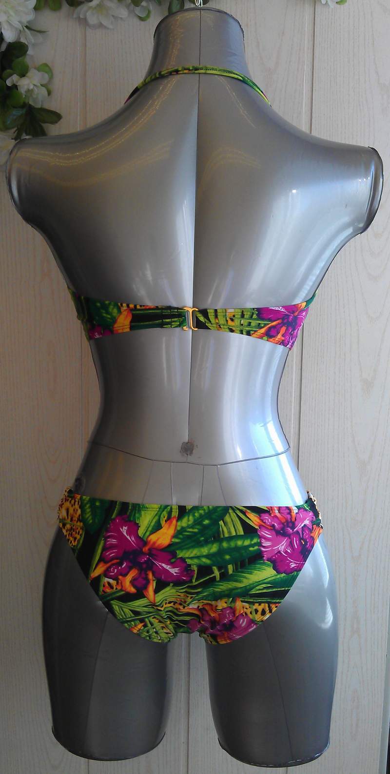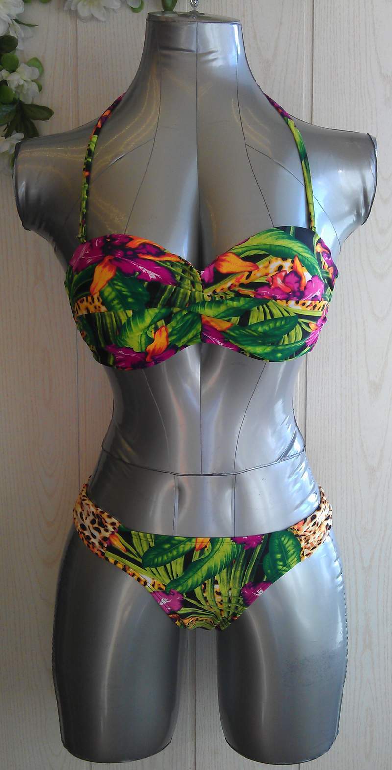 Очаровательный разноцветный купальник бандо с крупным цветочным рисунком. В комплекте съемная лямочка через шею.