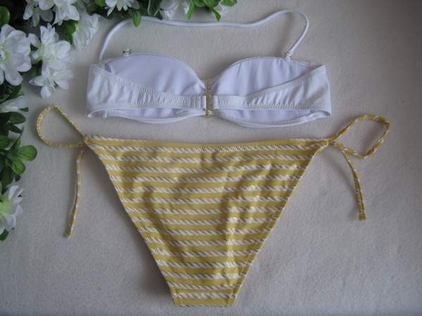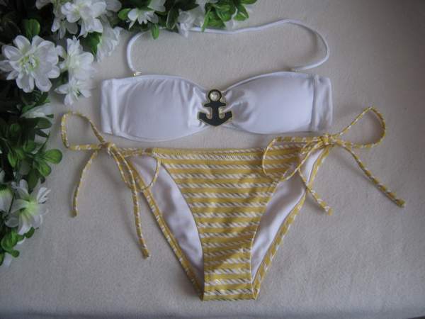 Бело-желтый раздельным купальник в морском стиле. Плавки декорированы рисунком-канатами, сбоку на завязках. Топ белого цвета украшен брошью в форме якоря, покрытой черной эмалью. Топ с поролоновыми чашечками сзади на застежке, дополнен съемной бретелью через шею.